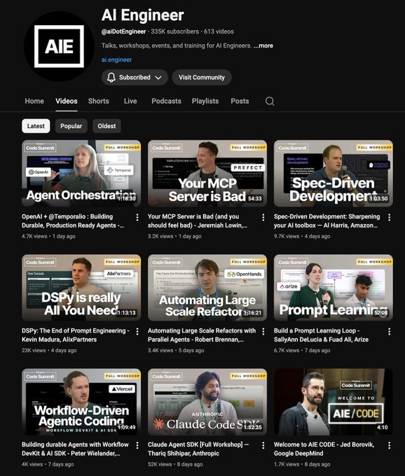 this is hands-down the best AI engineering channel to follow right now. there is so many videos presented by top researchers and engineers from the biggest companies on the most recent and up-to-date topics you must know. @aiDotEngineer is dominating youtube right now.