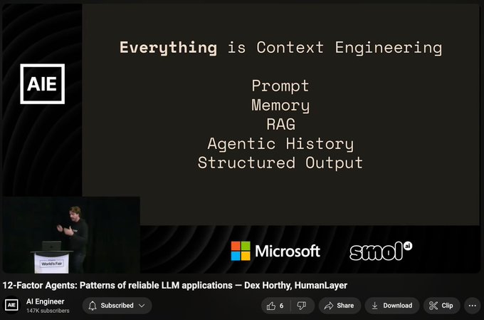 "everything that makes agents good is context engineering" excited to release @dexhorthy's talk at @aiDotEngineer, coiner of Context Engineering which has captured the zeitgeist of some of the most important problems in AI Engineering today!